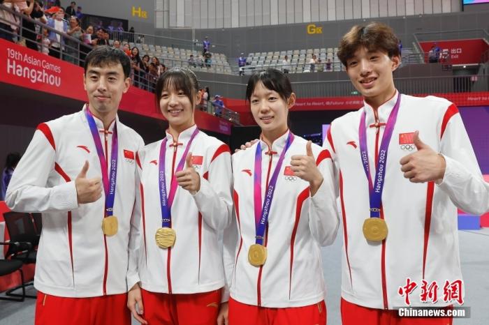9月25日晚,杭州第19届亚运会跆拳道竞技混合团体赛决赛在临安体育文化会展中心体育馆举行。中国队以84比77战胜韩国队,获得冠军。图为冠军中国选手宋兆祥、周泽琪、宋洁、崔阳(从左至右)在颁奖仪式后合影。
