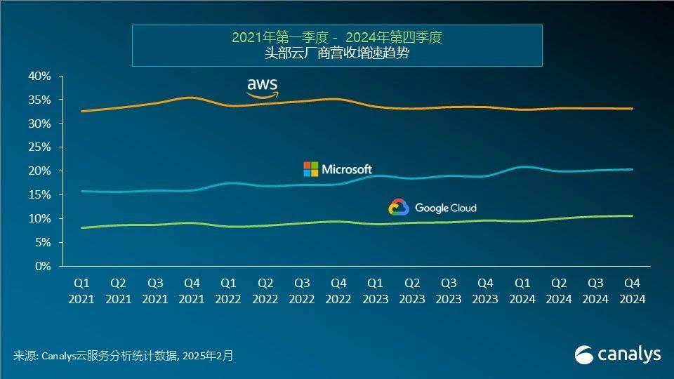 2024年第四季度,前三大云服务提供商——亚马逊云科技(AWS)、微软Azure和谷歌云的市场排名保持不变,三者合计占全球云支出市场的64%。它们的总支出同比增长25%。AWS作为市场领导者,年增长率维持在19%,与上一季度持平。与此同时,微软Azure和谷歌云的同比增长率相比上一季度略有下降。主要原因在于,AI驱动的强劲需求超出了供应能力,导致计算资源紧张,云厂商普遍报告市场供需关系趋于紧绷。
